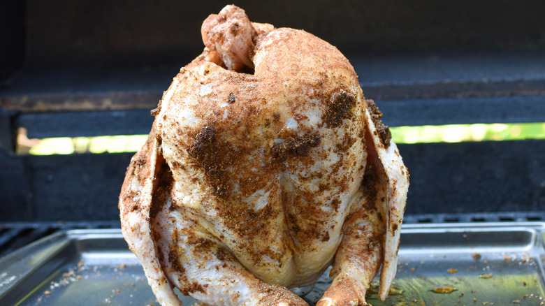Rapone suggests inserting a thermometer into the chicken at this time to keep more accurate track of the temperature of the chicken while it is on the grill.