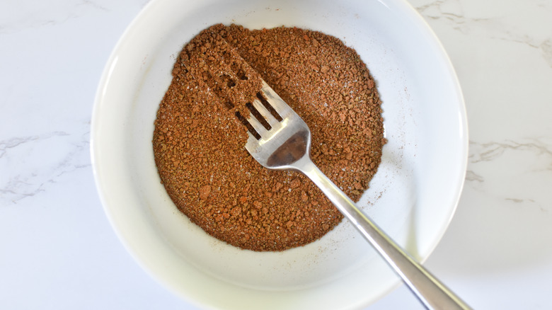 In a small bowl, add the ingredients for the chicken rub. This includes paprika, brown sugar, ground thyme, and kosher salt. Pour out half the beer (perhaps into a glass for yourself — you deserve it!). Take the can with the remaining beer and place it on a rimmed baking sheet. If you like, you can add a layer of foil first to prevent any messes.