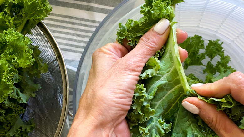- Put the kale leaves in a salad spinner, if you have one, and spin for 1 minute to get rid of all surface water.