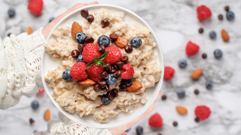 The American Heart Association (AHA) is quick to tote the benefits of including oatmeal in one's diet. When referring to the amount of fiber in porridge, the organization says, "It's like the scene in a movie where oatmeal takes off its glasses and everyone realizes just how beautiful it is." There are also plenty of healthy nutrients found in a single cup of oatmeal: four grams of fiber, 15% of the daily requirement of vitamin B1, and ample manganese — 59% of the recommended daily intake for men and 76% for women.