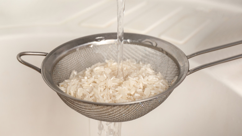 America's Test Kitchen suggests pouring the grains into a "colander or mesh sieve" and rinsing under cold water until the water runs clear (roughly two minutes). The Washington Post introduces a second method, suggesting that you put your rice in a bowl, cover it completely with water, churn it lightly with your fingers, and pour the water out. This should be done until the water is clear. And MasterClass reveals that the grains used for risotto and rice puddings don't require the water to run clear as they only need a rinse to wash away dust.