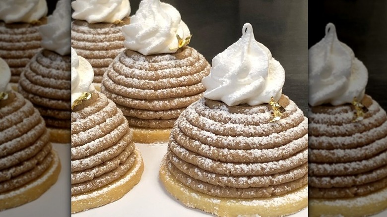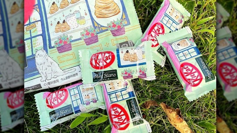 Meet the French-born Mont Blanc. While most Americans have never heard of this confection, its name comes from the Alpine mountain, Mont Blanc. Taste Atlas shares that the dessert's shape and a snow-like sprinkling of sugar, apparently, resemble the peak, earning it this moniker. Believed to be the best-known chestnut dessert, The Hungry Bites describes the Mont Blanc as "a thin tart base which is topped with a dome of whipped cream and then covered by chestnut puree in the form of thin vermicelli." Hugely popular in France and Switzerland, this unique treat has also gained a massive following in Japan — which brings us back to the KitKat and another unusual addition to the long list of KitKat flavors.
