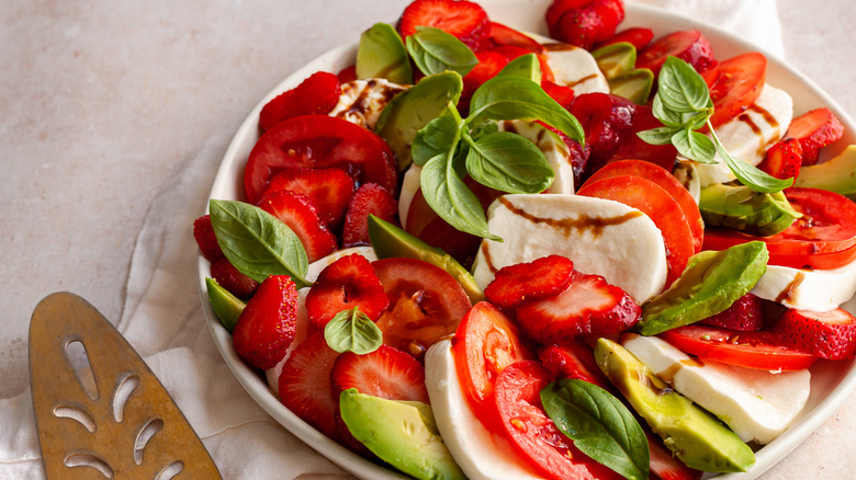Grab a serving plate and add the tomatoes, strawberries, avocado, and mozzarella. As a reminder, you should have chopped these ahead of time. "The slices should be a standard size for a Caprese salad, about ⅛ inch," Musgrave notes.