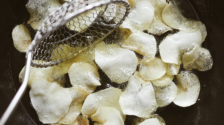 - In a Dutch oven or large heavy-bottomed pot, add the oil. Heat over medium-high until the temperature reaches 350 F. Add the potato slices in batches and stir gently. Fry until golden brown, approximately 4-5 minutes, and using a slotted spoon or spider, transfer the potato slices to a drying rack to drain any excess oil.