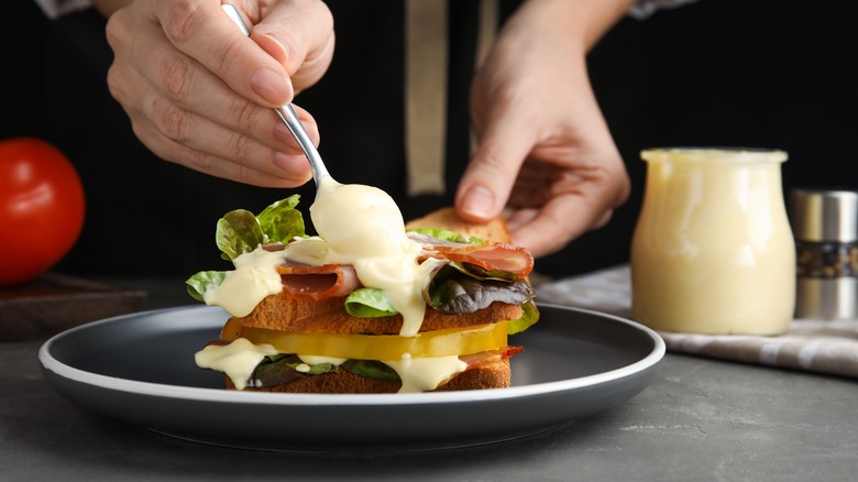 With a creamy but ever-so-slightly tangy finish, traditional mayonnaise is a truly versatile condiment that can make for the perfect grilled cheese or a juicy and golden roasted turkey. To achieve that distinct taste, most mayonnaise recipes follow a similar structure, and it's so simple you can easily make it yourself. A combination of eggs, oil, and a little bit of acid like vinegar or lemon juice is all it takes to make homemade mayonnaise, but there are often some other ingredients included for additional flavor and differentiation between brands. A hint of dijon mustard is a popular enhancement, or maybe even a sprinkle of sugar.