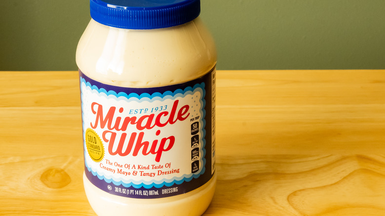 Miracle Whip is one of those brands that people feel very strongly about. The hardest fact to swallow here — and possibly the thing that most sets it apart — may be that Miracle Whip isn't technically considered mayonnaise. Yep, you read that right. For the sake of comparison, we are going to treat it as such because it is used just the same way as "true" mayonnaise brands, but when it comes to FDA guidelines, it has less than the required 65% vegetable oil requirement to be considered a mayo, and as such it falls under the "dressing" category.