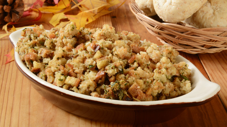 On Thanksgiving, there's pretty much nothing more classic than stuffing ... except for the turkey your stuffing is (theoretically) stuffing, of course. Unfortunately, that idea sort of falls apart upon closer examination. Stuffing isn't just one thing, after all. There are countless stuffing recipes out there. As noted by Slate, the stuffing used in American Thanksgiving can include just about anything, such as the traditional bread and rice, as well as bacon, chiles, mushrooms, nuts, oysters, potatoes, raisins, sausages, tamales, and more. People can't even agree on stuffing's true name! Is it "stuffing" or "dressing," or as the Washington Post suggests, is it "filling?" Should we actually bake it inside the turkey or is that just an outdated concept?