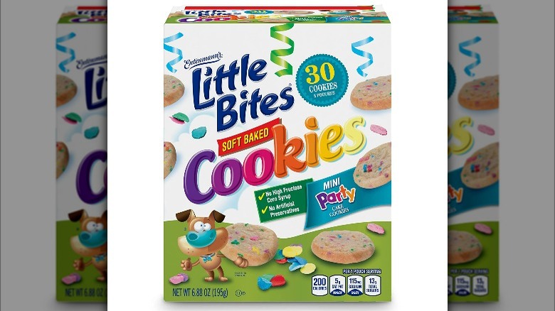 While Entenmann's is best known for the Little Bite Muffins they carry, they also have two mini cookie snacks, as well. The first item on this list is one of those snacks — the Party Cake Cookies. These take on the flavor of a delicious birthday cake, but in a soft-baked cookie form. These sweet cookies are made with colorful rainbow sprinkles inside and contain six cookies per pouch. A sugary treat like birthday cake is welcomed flavor in milkshakes, ice creams, and yes, even these cookies. While these cookies taste on par with many birthday cake-flavored products, however, there's a bit that could be improved.