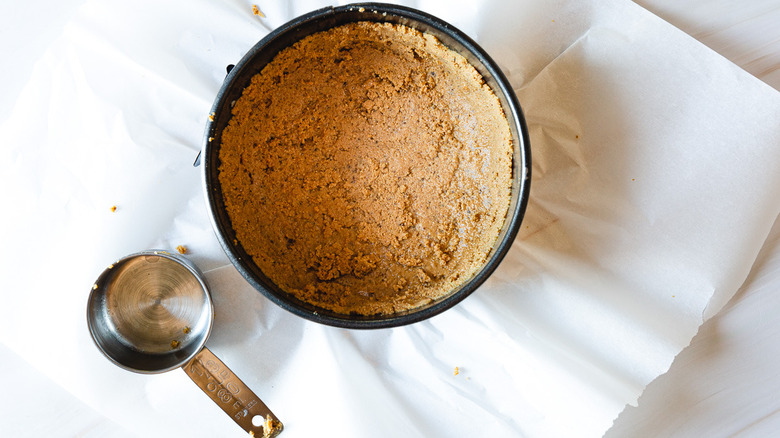 To make the cheesecake base, you will need graham cracker crumbs and butter. If you don't have graham cracker crumbs, you can make your own by grinding graham crackers, or another type of cookie of your choice in a food processor.