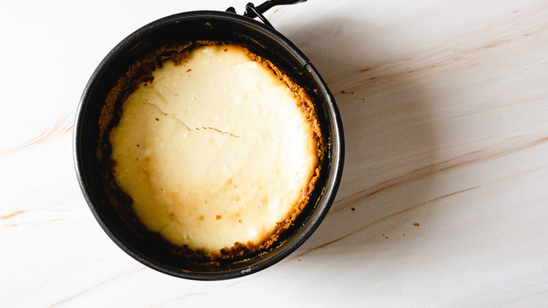- Pour the cheesecake mixture into the crust, and smooth it with a spatula. Bake for 60 to 70 minutes, until the cake looks firm but still jiggles in the center.
