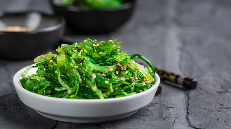 Growing wild in Australia, and farmed in Japan and South Korea, wakame is a vibrantly green marine alga that, like kombu, is frequently used in Japanese cuisine (via MasterClass). Wakame must be rehydrated before use, and then it can be used in soups, salads, and your favorite ramen recipes.