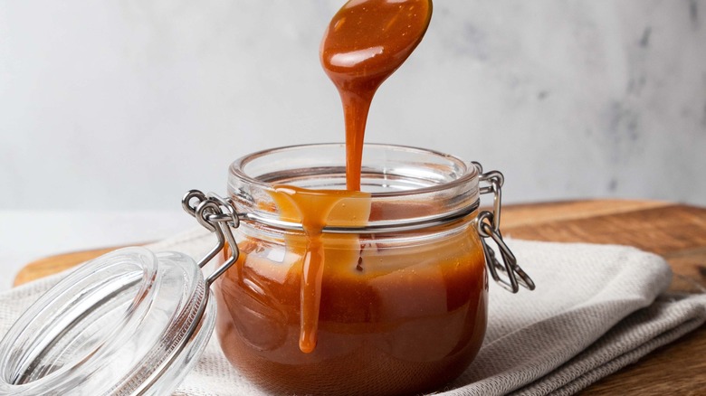 One taste of caramel will instantly boost a person's fall festivity. Caramel sauce is made by heating sugar until it turns to liquid and changes from clear to a deep amber hue. When it cools, it firms up into hard caramel candy, or it can be mixed with things, such as butter and cream, to create gooey caramel sauce. The flavor is warm, with soft, almost burnt notes that give the feeling of being wrapped in a blanket. Extra salt can be added to make a salty-sweet treat, or brown sugar can be used instead of white sugar to add an extra roundness to the flavor.