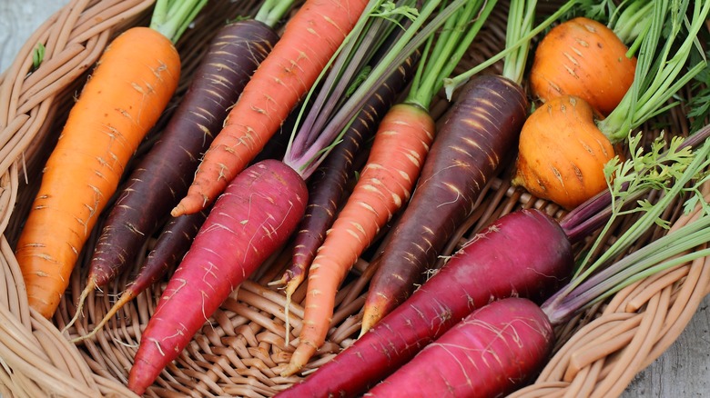 Carrots aren't just for bunnies. This root vegetable is a worthwhile addition to any fall table. Carrots come predominantly into season during late summer and late fall (via When is the Season). Much like sweet potatoes, this vegetable gets lost in favor of pumpkin; but this root is due for a resurgence. Carrots have many health benefits and are high in beta-carotene and key vitamins, as noted by Healthline. In addition, they offer a sweet and earthy flavor and come in as many colors as the leaves of fall.