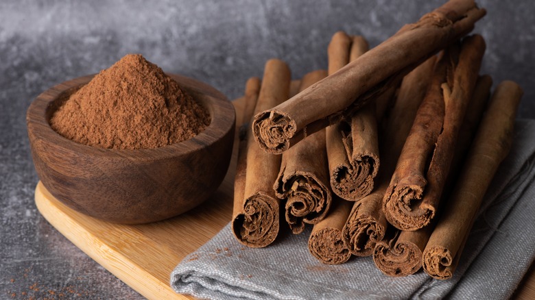 Cinnamon is an aromatic and powerful spice. One whiff of it will send anyone into warm sweaters, cool brisk days, and changing leaves. This is appropriate because cinnamon comes from a tree itself. The bark of the cinnamon tree is peeled and dried. As it dries, it forms cinnamon sticks that can be used on their own or crushed to make powder (via Healthline). Cinnamon was one of the first traded spices around the world. This isn't surprising, considering it can be used in savory or sweet dishes and has many health benefits.