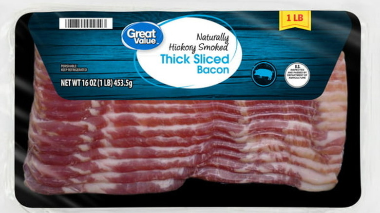 Is there such a thing as bad bacon? Of course there is — although that's usually just the result of it spoiling, or being cooked incorrectly, rather than an indication of quality. There are undoubtedly exceptions to the rule that everything in life is better with bacon, but we're not here to discuss any potentially poor versions of the salted pork product. Rather, we're here to inform you that you should feel absolutely comfortable buying Great Value Naturally Hickory Smoked Thick Sliced Bacon from Walmart.