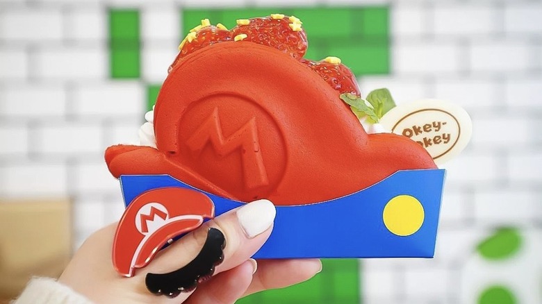 Japanese theme parks can come up with truly unique and creative snacks such as the Mario's Cap Strawberry Shortcake Pancake Sandwich. This dessert, according to Mario Wiki, comes in the shape of Mario's iconic hat and is filled with buttercream that is sandwiched between two strawberry shortcake-flavored pancakes. The buttercream is then decorated with strawberries, as well as an edible wafer embellishment that can either read "Whose cap?" or "Okey-dokey." This sandwich also comes in a grape cheesecake variety styled after Luigi (via Mario Wiki).