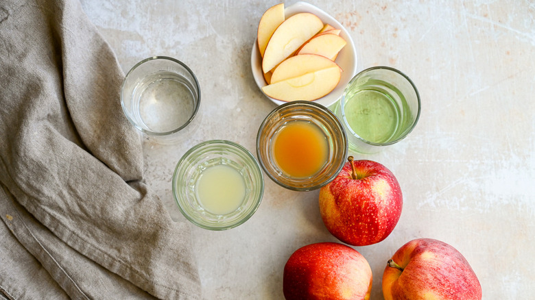 To decorate your drink, you can use a slice or two of apple. In order to prevent the apple from turning brown, you can soak or dip the slice in lemon juice before floating it in your drink. As an alternative, Musgrave suggests that "You could use a dehydrated apple, apple candy, or lemon twist" for a garnish in place of the apple slice.
