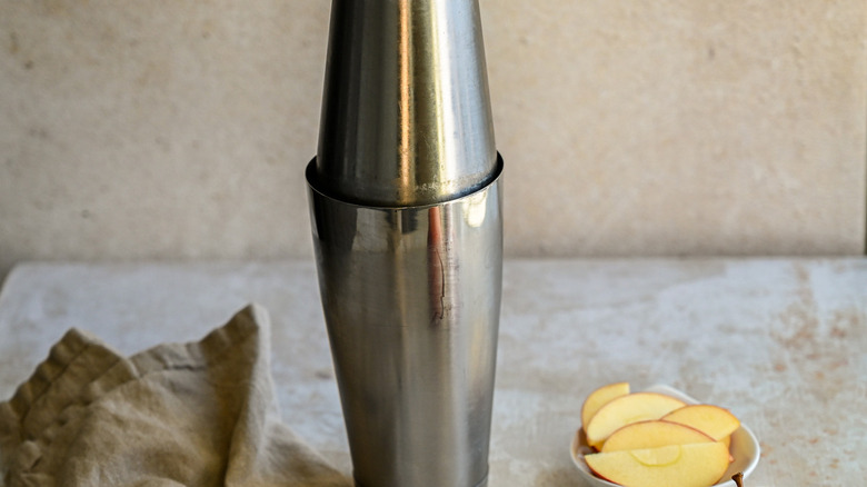 - Combine all of the ingredients, except the apple slice, in a cocktail shaker.