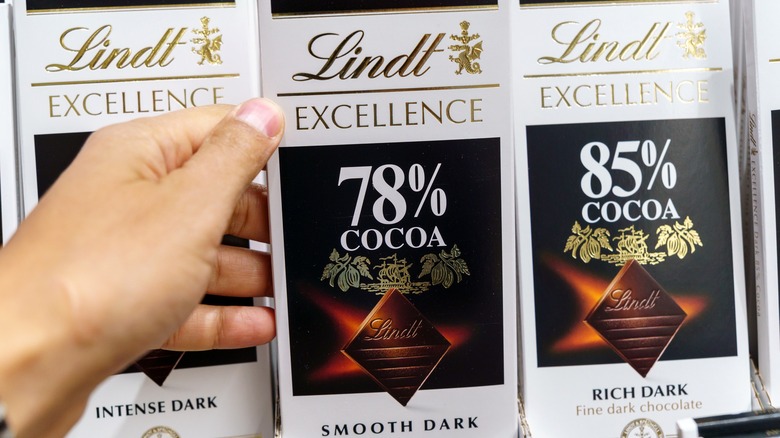 According to Lindt, its bitter-sweet bars are 49% cocoa. This means it beats out competitor Hershey's semi-sweet baking bars' cocoa content by 7%, per Stop and Shop. And aside from having a high cocoa count, Lindt reports its products' great flavor is also thanks to the company's dedication to painstakingly choosing the best cocoa beans for its sweets. In fact, the brand prides itself on being a gourmet chocolate maker that produces its sweets from "bean to bar." And Statista reports Lindt's efforts have earned it a place in the top ten best-selling chocolate brands — not to mention, a claim to fame as Ina Garten's secret ingredient for baking the best chocolate cookies.