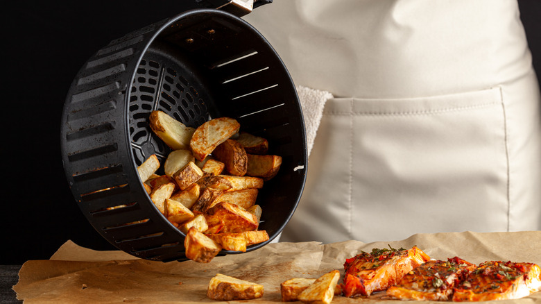 Begin by chopping your potatoes into chunks — about 3-inch slices will do. Place the potatoes in a bowl and toss them with olive oil, oregano, salt, and pepper. Once your potatoes are oiled and seasoned, line your air fryer basket with parchment to prevent sticking and add in your seasoned potatoes. Cook at 380 degrees Fahrenheit for 10 minutes, then turn and cook for another 10 minutes. Your potatoes are done when they're golden and crispy. This technique will give you extra crunchy potatoes with fewer calories than if you were frying them, in a fraction of the time the oven-roasted variety would take.