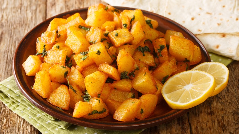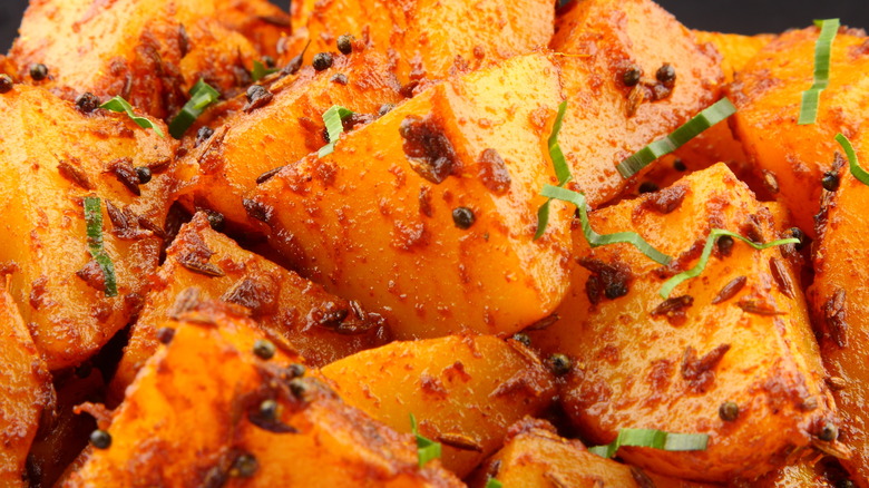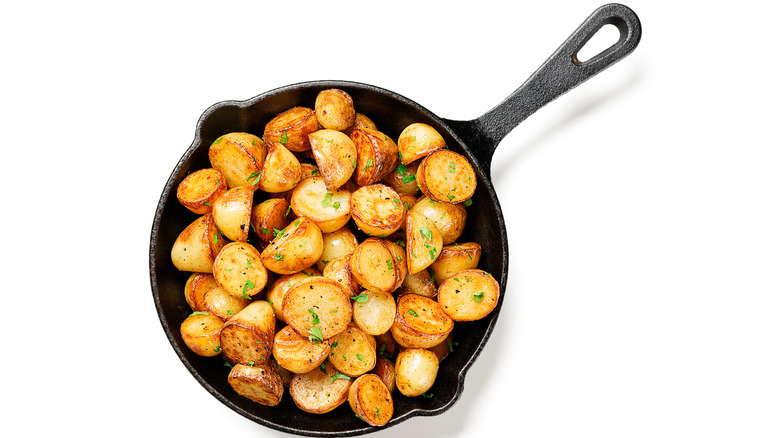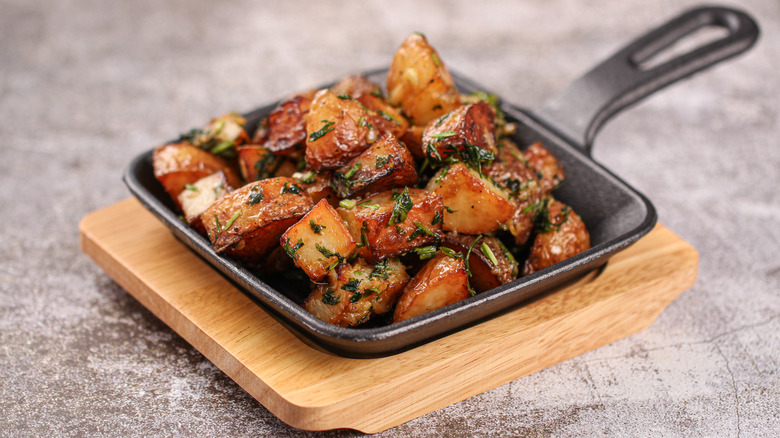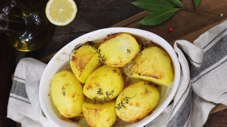Roasted potatoes are a versatile and delicious side dish. Everyone has their favorite way of cooking them, but sometimes it's good to mix things up once in a while. No matter what you're adding to your roasted potatoes, there are some basic tips to keep in mind. One of the most important decisions you'll make is the choice of potato. According to Real Simple, floury, starchy varieties like Yukon golds or russet work best, as they have a creamy texture, and crispy outside. If you want to enjoy the contrast between the fluffy inside and crunchy exterior, make sure you don't cut your potatoes too small either.