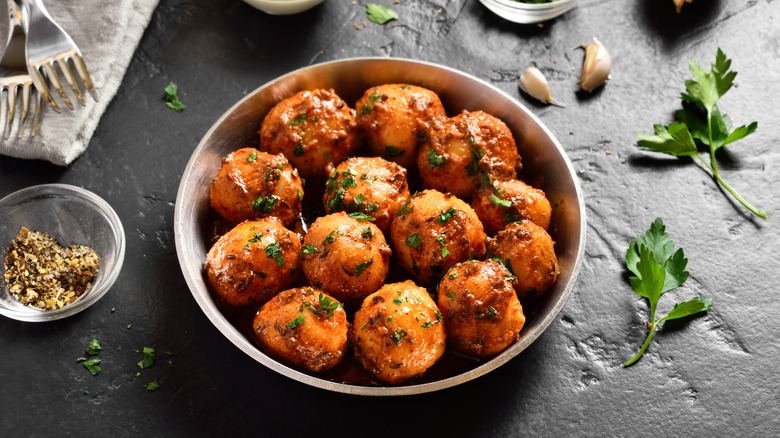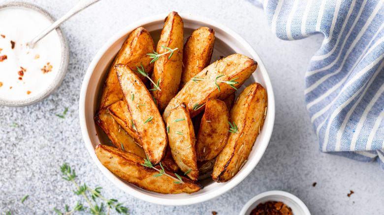 Combine dried oregano, dried thyme, garlic granules or garlic powder, dried parsley, and pepper (via The Dinner Bite). Mix up your seasonings and save them in a mason jar or other airtight container, and keep somewhere away from sunlight for up to six months. Use 1 tablespoon of seasoning per 2 pounds of potatoes. Once your potatoes have been in the oven for half their cooking time, gently squash them with the back of a spoon or a large jar, so you end up with even more crispy edges.