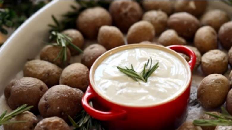 To start, toss your potatoes in oil and minced garlic. Using coarse sea salt, build a bed in a sheet pan or roasting dish, then sprinkle peppercorns and rosemary on top. Line the pan with your potatoes and pop them in the oven, then bake at 425 degrees Fahrenheit for 30-40 minutes. According to Alpha Foodie, cooking your potatoes on a bed of salt traps any moisture that escapes during cooking. This is then reabsorbed by the potato, so you end up with a perfectly fluffy result. The salt bed also helps to regulate oven temperature, so everything cooks more evenly.
