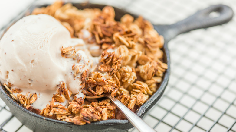 One tip: Southern Living advises keeping the top crust inside the pan, which saves you some work. The deep sides of a cast iron skillet eliminate the need to crimp the pie's edges — plus they prevent the sugary fruit juices from bubbling over and ruining the bottom of your oven. For the most even heating process, bake the pie on the bottom shelf of the oven to achieve a flaky crust. Once it's done, carry the cast iron pan directly from the oven to the table, farmhouse-chic style. Whether you grab a fork and dig in or cut an impressively thick slab of pie, you may never return to your old baking method again.