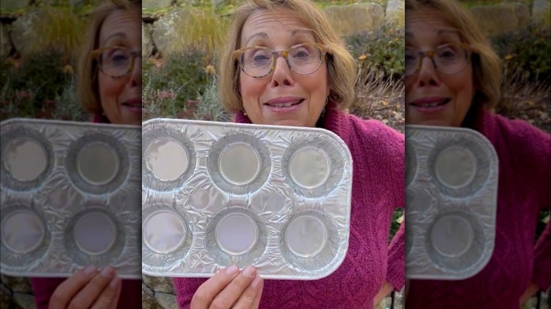 "Did your mom tell you the easiest way to send guests home with Thanksgiving leftovers?" @brunchwithbabs aka "everyone's grandmother," asked in a recent video. According to the content creator, if you use disposable muffin tins for leftovers, your guests will be able to take their fill of apple pie and ham home in one vessel without having to worry about their food mixing. Plus, they'll even be able to heat up the remains of Thanksgiving dinner with the same tin they used to store the food.