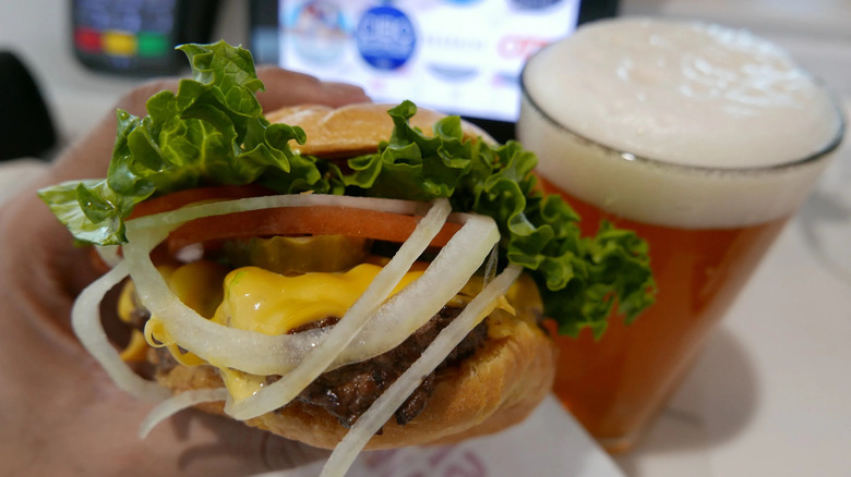One way Smashburger is attempting to grow is by introducing bars to its stores. Per QSR Magazine, in March of 2022, the chain debuted its first full, official bar at one of its sites in Denver. There, customers can find ice-cold beers, both on draft and in cans, as well as signature cocktails like the Blackberry Smash, a Coconut Mule, the Smash Rum Punch, and Smoke & Spice Margarita, among others. The venture kicked off with a happy hour grand opening celebration that let diners get a draft beer for $10 alongside their classic burger. Swag was also available.