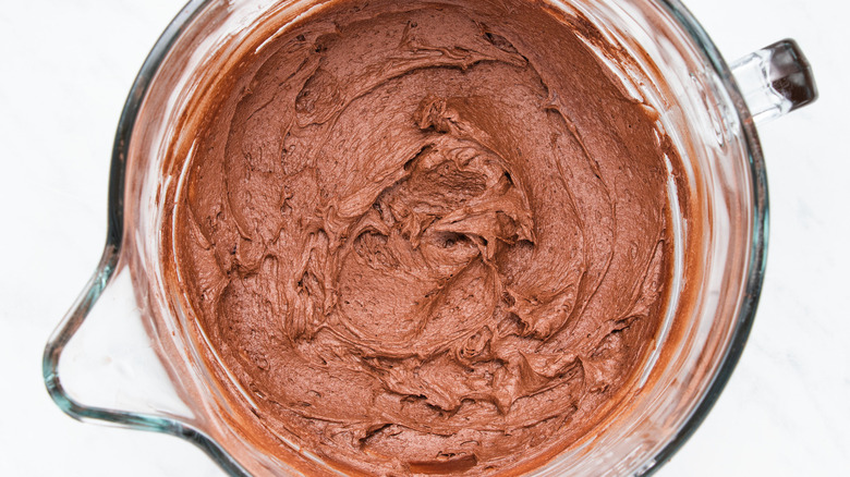 - Sift in about ⅓ of the powdered sugar, ⅓ of the remaining cocoa powder, and a splash of milk. Beat until combined. Then repeat twice more until everything has been added. Adjust the amount of milk as needed. You want the frosting to be smooth and spreadable but still firm enough to hold its shape.