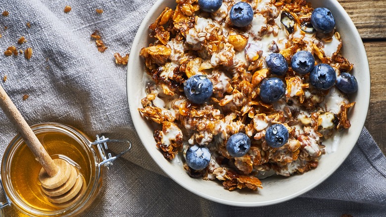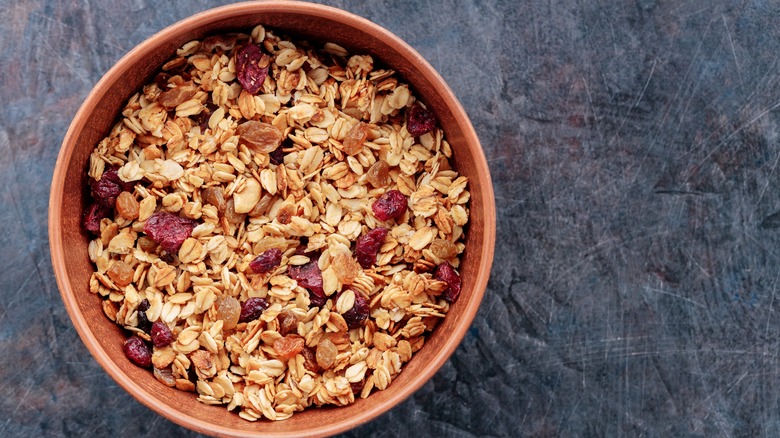The answer to that may surprise you — it isn't something that you need to do, but rather something that you shouldn't do. To get plenty of those delicious clusters in your homemade granola, you should stop stirring the mixture about halfway through the baking process. This may seem counter-productive to creating the best granola, but according to Bon Appétit, you only need to allow the granola to bake some in order to set. In the beginning, stir the granola a few times so that it becomes evenly toasted, but about halfway through the baking time, simply leave it alone.