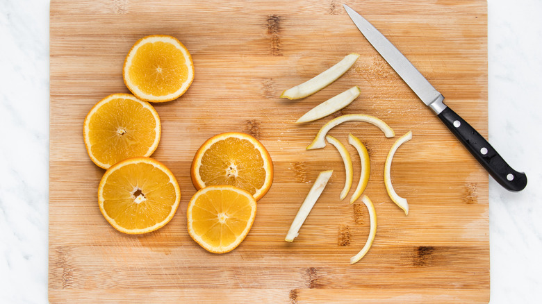 - Slice the orange into rounds. Separate the lemon flesh from the rind using a knife, and slice the rind into strips, discarding the lemon flesh.