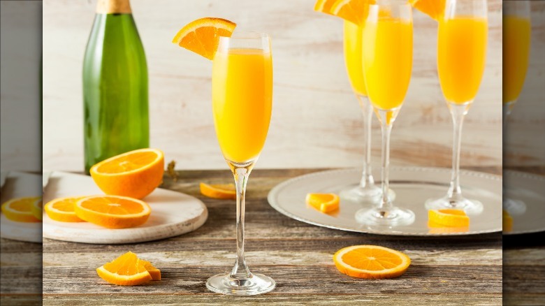 Other champagne cocktails contain even fewer ingredients than that. For example, the classic Kir Royale comes with sparkling white wine and crème de cassis (via Cocktail Party App). Even the classic Mimosa falls into this category, typically made with orange juice, champagne, and triple sec if you happen to have it on hand — though it is not a necessity (via Cocktail Party App). You'll find that there are a lot of cocktails that fall under this family, as your drink truly just needs a spritz of champagne or sparkling wine on top to be considered part of the category.