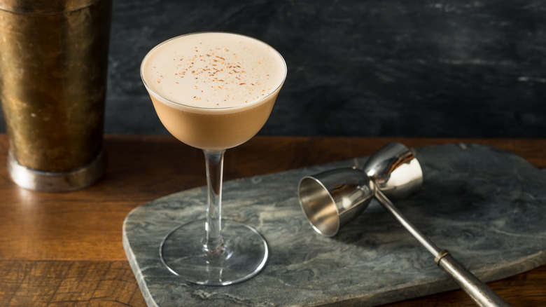 Some, but not all drinks in the creamy cocktails category are made with eggs. Similar to flips — which are spirits and sweeteners mixed with egg, via Liber and Company – cocktails made with eggs are double-strained in order to achieve that creamy texture we all know and love (via Cocktail Party App). Some classic creamy egg drinks include the gin fizz, made with gin, lemon juice, simple syrup, sparkling water, and half an egg white; the golden fizz, which swaps out the egg white for a whole, lightly beaten egg; and the rum flip, which features rum, brown sugar, nutmeg, and a whole egg (via Cocktail Party App).