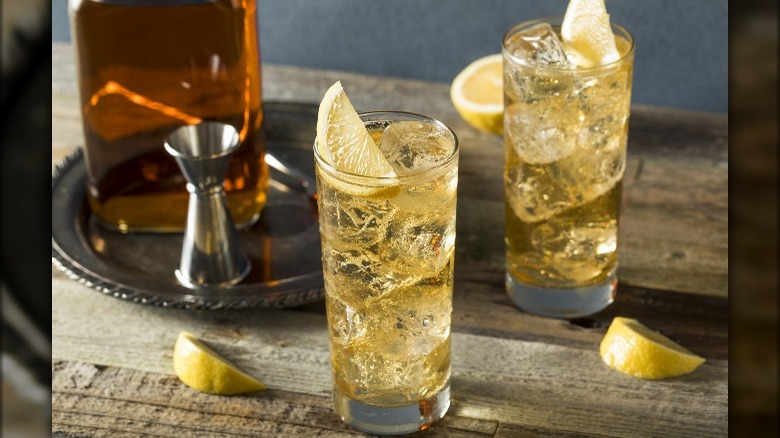 When crafting a highball, you will want to start with a shot of your liquor of choice as a base and top it with a mixer (via Cocktail Party App). A recipe for the classic highball for which this category got its name is simple: two parts rye whisky and three parts ginger ale. Substitute gin in for the rye, and add lemon juice and sugar to your highball, and you have made a Collins (via Quarentinis, Eh?). There is actually an entire lineup of Collins variations, but the classic Tom Collins is made with Old Tom gin specifically (via Difford's Guide).
