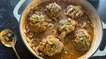 The mini beef patties are highly seasoned with dried spices and umami-rich Worcestershire sauce. The sauce is accented by acidic ketchup and tangy Dijon mustard. For a more elegant presentation, combine different types of mushrooms, including cremini, porcini, and chanterelles. In keeping with the nostalgia of the TV dinner, serve this dish with mashed potatoes and sautéed peas or carrots.