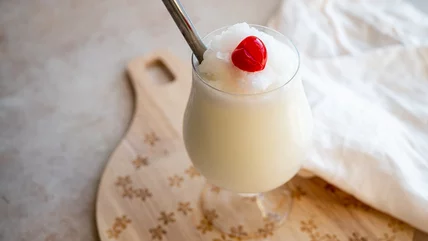 Now, just pour the piña colada into a glass of your choice and top it with a maraschino cherry. "You can add a rum floater on top of the drink or top with a pineapple slice," Musgrave adds.
