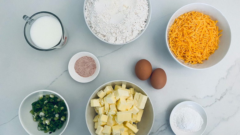 Gather the ingredients for the cheddar scallion buttermilk biscuits