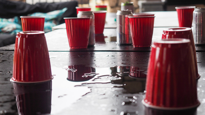 If you went to college, chances are you've played flip cup. According to a survey from College Stats, flip cup is the third most popular drinking game among college students, coming in behind quarters in the No. 2 spot and beer pong in top place. To get a flip cup game started with you and your BFF, all you need is two lightweight plastic cups, like the Solo 16-ounce plastic drinking cups ubiquitous at keg parties (if you've never been to a keg party, you're a better person than us). You'll also need a table and some alcohol (via BarGames101). Beer is ideal, but you can choose any drink you like — whiskey, tequila, or champagne (if you're classy like that). And hey, there's always "near beer."