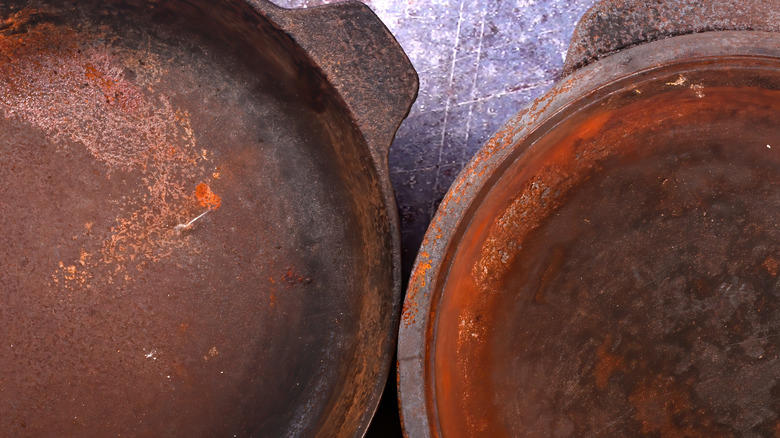 If you do accidentally burn something to the bottom of a cast iron skillet or your Dutch oven rusts because you left it out wet, you can still salvage it. Lodge recommends scrubbing the pan with steel wool to remove all rust, then washing it in warm, soapy water. Next, dry it with a lint-free cloth or by heating it on the stovetop. Once it is dry, season your cast iron pan and it should be good as new. If it feels sticky when you finish seasoning it, simply place it back in the hot oven for an extra hour to burn off any excess oil.