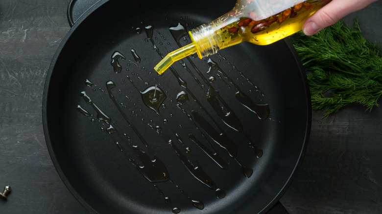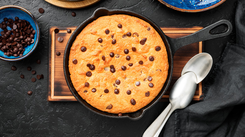 Cast iron pans heat up and retain heat better than other bakeware (per Lodge), which means you may need to adjust baking times when your bake in your cast iron pan. Otherwise, your baked goods might end up overcooked or even burned. When trying a recipe in a cast iron pan for the first time, reduce the baking time by five minutes. At that time, check to see if it is done. For many baked goods, you can do so by inserting a clean toothpick into the center. If it comes out wet or with batter sticking to it, put it back in the oven for a few minutes. It's better to check it too early than pull out a dish that is burnt or dry.
