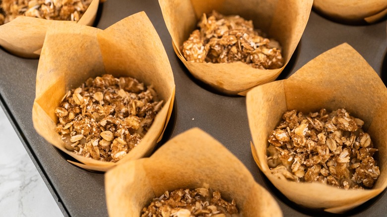 This method however isn't quite as effective if you add oats into the equation. Oats, unlike flour, don't absorb moisture as easily, Kitchn explains. Even when they're included in a wet mixture, oats take longer to hydrate, and that means they can remain tough by the time you finish baking your muffins. The solution, therefore, is to give the oats enough time to hydrate before you add them to your muffin batter.
