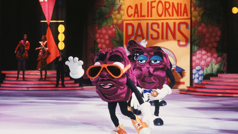 Is there any raisin mascot more iconic than Sun-Maid Girl Lorraine Collett Petersen? The California Raisins may give her a run for her money. Back in the day, they were all the rage! The Raisin Advisory Board, which Sun-Maid was once part of, per the New York Times, unveiled these dry, dancing grapes in 1986, as documented by Food & Wine. The idea was to make raisins more popular and exciting, having failed to market them previously as nature's candy, for example. So, creatives took the beloved and serendipitously named song, "I Heard It Through the Grapevine," then recruited a pioneer of the up-and-coming claymation artform, and smashed it all together to personify raisins in a striking commercial (via YouTube).
