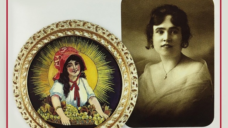 It turns out the Sun-Maid Girl was a real person. As Sun-Maid explains, L.R. Payne, as company director, came across a young woman drying her hair in a bonnet and decided she was picture-perfect for their purposes. Sun-Maid's Japanese division gives more detail: Lorraine Collett Petersen was a 17-year-old girl working as a representative of Sun-Maid in May of 1915 at San Francisco's Panama-Pacific International Expo. There, she handed out samples while wearing a white blouse with blue piping and a blue sunbonnet. It wasn't until later, at her parents' home in Fresno, that Petersen changed into her mother's red bonnet and was spotted by Sun-Maid folks in her backyard. The wife of an executive (presumably Payne) suggested the red bonnet would be a good look for Sun-Maid since it matched the sun's shade. Petersen was given a basket of grapes to hold, and artist Fanny Scafford painted a watercolor that made its way onto packaging the next year.