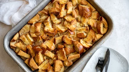 One such dish is bread pudding, a thrifty dessert or brunch dish that allows you to re-purpose day-old (or older) bread. While recipe developer Christina Musgrave uses brioche in this recipe, she says "You can use any bread you like or change it up with croissants." In fact, you could even use stale doughnuts.