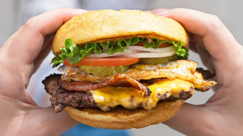 The fast food burger is a cornerstone of American cuisine. Hamburger, cheeseburger, with or without bacon, whichever your preference, nationwide joints like McDonald's and Wendy's will have you covered. Even if you're a burger lover who has gone meatless, franchises like Burger King have given Impossible burgers and other meat alternatives regular spots on the menu. International and regional fast food chains will serve you a burger at any hour of the day. Well, almost any hour. As it stands, most fast food establishments with a breakfast menu won't serve you a cheeseburger during breakfast hours.