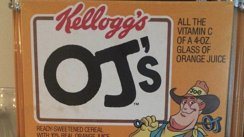 One attempt at citrus cereal was OJ's, a 1985 introduction by Kellogg's. Logically, the cereal pieces were "O"-shaped like so many others that came before and after OJ's. Meanwhile, Kellogg's was no less than emphatic about the orange-ness of OJ's — the box was orange, included the image of a cowboy mascot named Joe the OJ's Orange Rancher, and claimed to be fortified with as much Vitamin C as half a glass of orange juice, thus saving calories and time at breakfast.