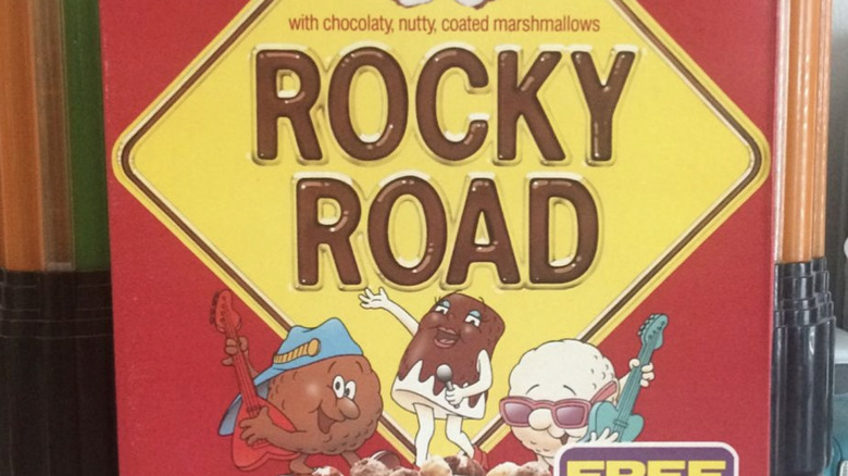 While probably not the most nutritious way to start the day, it's hard to care about healthy eating when a person's got a big bowl of dessert in front of them. Rocky Road was absolutely delicious, built on a foundation of puffed corn balls, which cereal engineers heavily sweetened to differentiate them from their somber, less sugary cousins in Kix. Alongside those whitish yellow cereal balls came little brown balls of the same size — but those weren't cereal at all, but rather miniature marshmallows. Already sweet, those came coated in a chocolate mixture, and after that, they got another upgrade with finely-diced nut topping. Perhaps it was too much of a good thing — Rocky Road disappeared not long after its debut, despite boasting three advertising mascots, a rock band consisting of guitarists Choco and Van and singer Marsha.