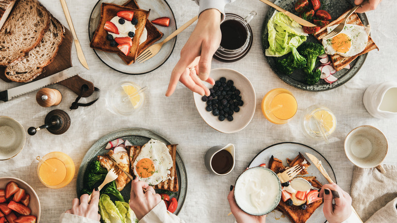 Ah, brunch. That six-letter portmanteau that's now a seamless part of everyone's vocabulary. The breakfast-meets-lunch weekend event that's become so ingrained in our culture we've even turned it into a verb. Believed to be first seen in print in a Hunter's Weekly article in 1895, per Smithsonian Magazine, the author of "Brunch: A Plea" argued that the concept of brunch "puts you in a good temper, it makes you satisfied with yourself and your fellow beings, it sweeps away the worries and cobwebs of the week.”